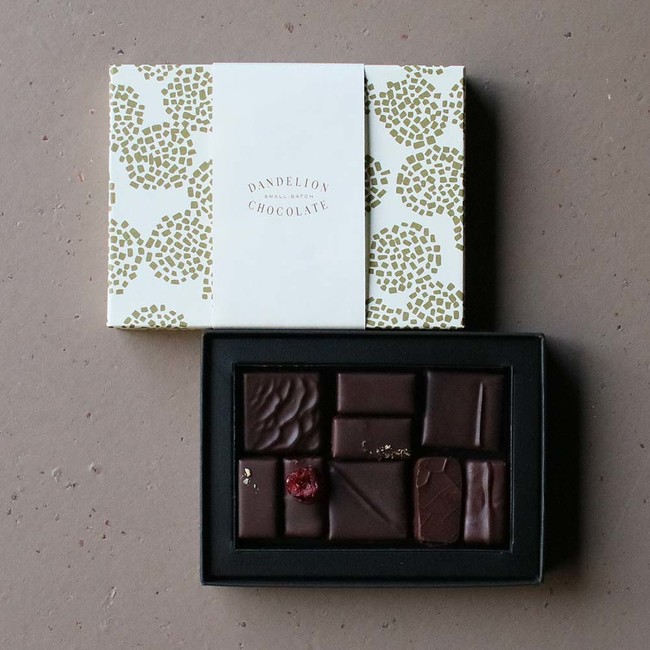 バッケージはダンデライオン・チョコレートのシグネチャーアイテムでもあるチョコレートバーの包装紙からデザインし、贈り物にふさわしい上品な仕上がりになっています。6個入りと9個入りと2種類のセットをご用意しましたので、用途に応じてお選びいただけます。